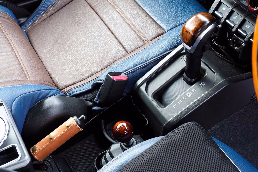無骨とシンプルを上手く融合させたジムニー。インテリアにはウッド調のアイテムを使う事で、森をイメージしたという。程よいリフトアップで、まとまり感のあるオシャレジムニーとなっている。